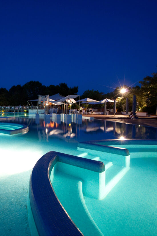 La piscina di 2000 mq, circondata da una cornice di verdi colline, garantisce sicuro relax senza rinunciare al divertimento, in una location indimenticabile unica nel suo genere. Tre vasche idromassaggio, due vasche per bambini, vasca da allenamento e zona “effetto spiaggia”.